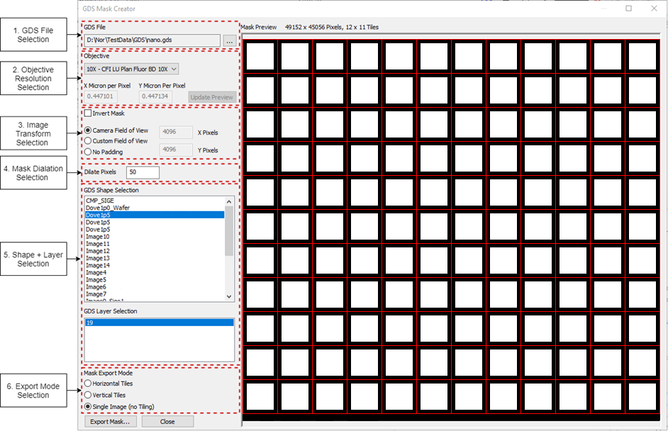 After clicking Export Mask… in the GDS Mask Creator, you must set the mask’s filename as your target template’s filename. For example, if your target template is nano_demo_0001_template.png, then your mask’s filename should be nano_demo.png. After exporting, you may overwrite your template’s mask(s). Warning: If you export into the directory containing your target template, there will be no prompt to confirm overwrite of existing masks.
