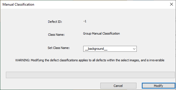 Shift + M while moving mouse (to open dialog) to change a single defect classification name to any classification name in the drop down (Drop down is based off all defect classes that were present in the model at time of analysis).