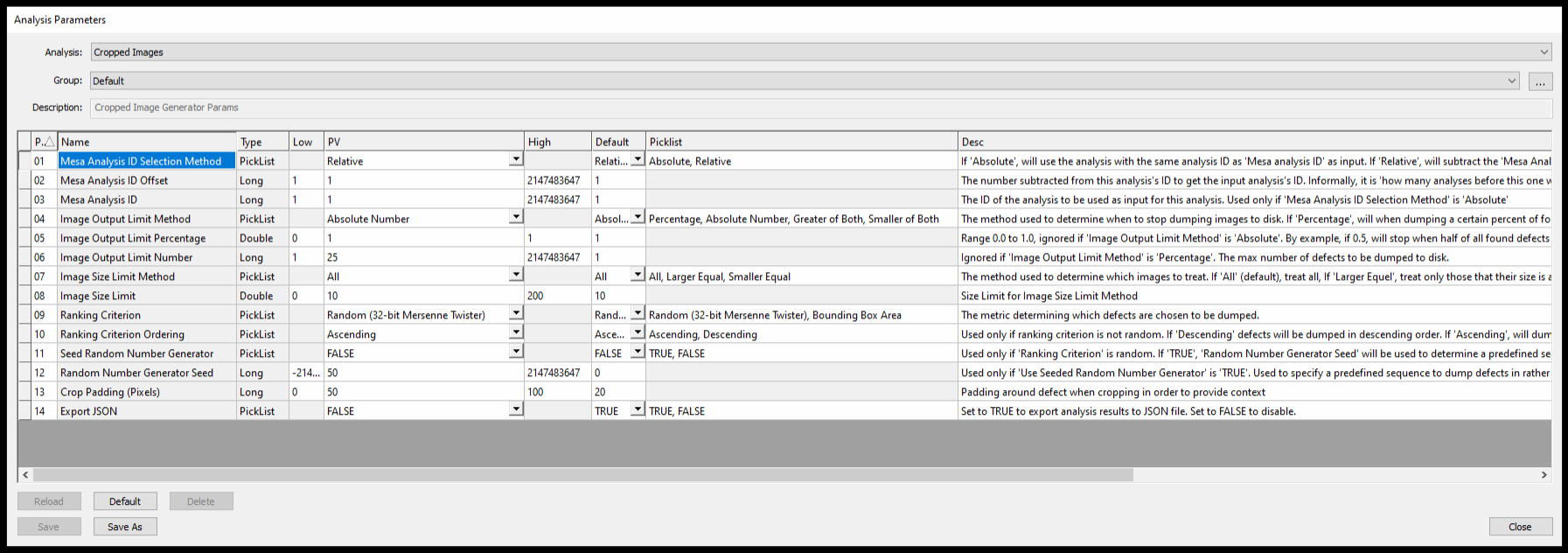 This analysis is best leveraged by saving it to an Analysis Group in tandem with another analysis, as part of an inspection Job. When doing so, make sure that Mesa Analysis ID Selection Method is set to Relative, with the appropriate Mesa Analysis ID Offset targeting the previous analysis with a value of 1. For analysis groups that run more than 2 analyzers, this offset may need to be higher. To add some padding around the cropped defects, use Crop Padding (Pixels), which will allow you to see some context around the defect when reviewing these images outside of nSpec.