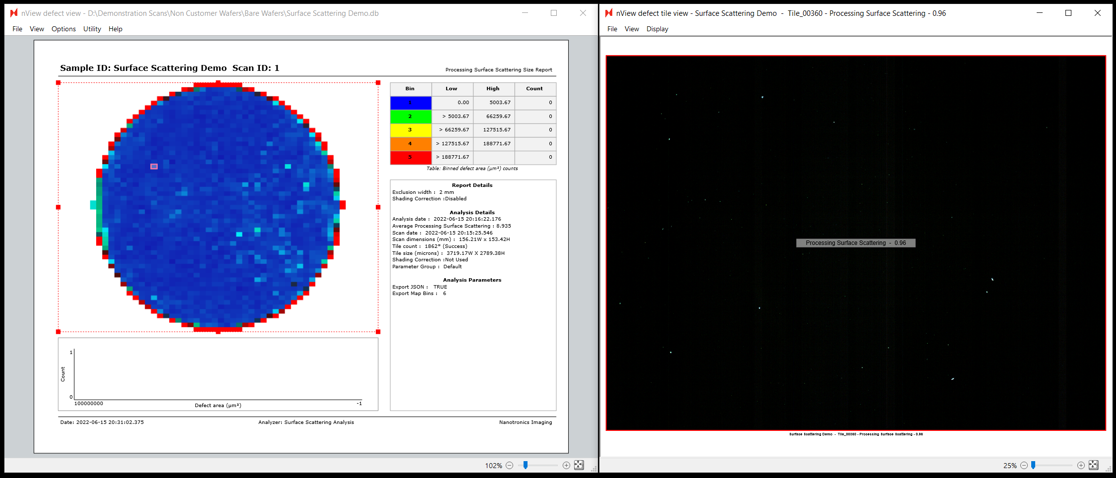 nSpec’s Surface Scattering Analysis works by measuring the intensity of scattered light when scanning a sample in Darkfield Illumination mode. This analyzer has two reporting options: