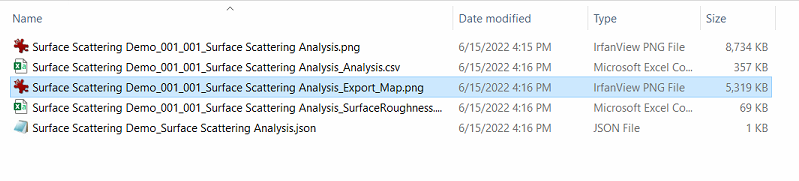The analysis parameters also provide an option to export the standard JSON file that all nSpec analyzers generate, however since this analysis does not produce defect-type results this JSON file will be mostly empty and not interesting to consume externally. We recommend instead focusing on the surface scattering PNG and CSV exports, or using the interactive report within nView.