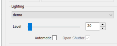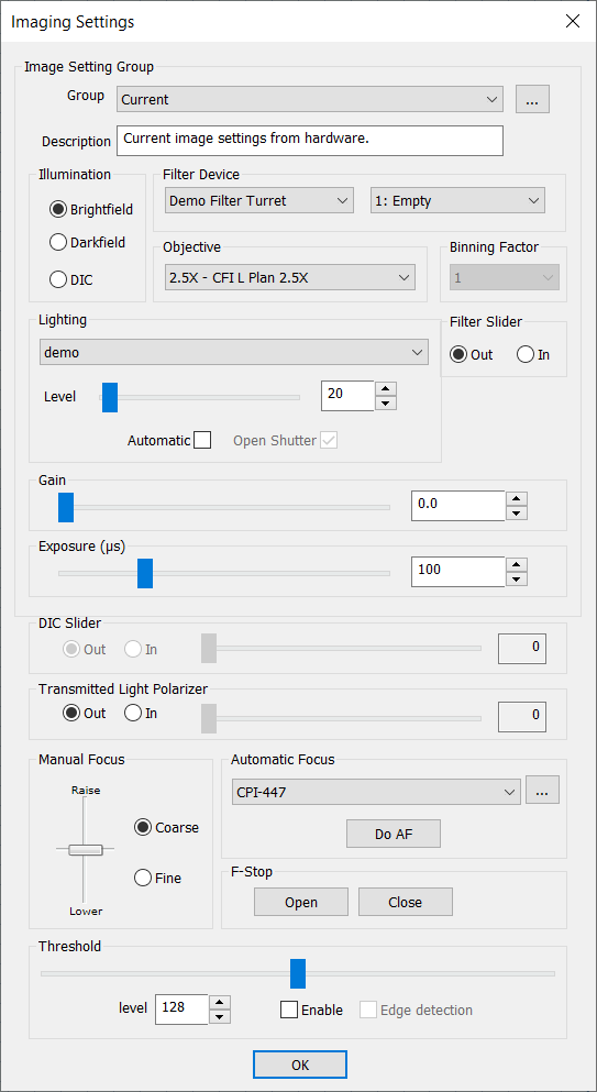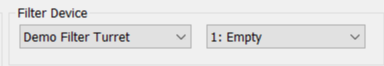 The Filter Device dropdown allows the user set the active slot used for a number of different filter devices. The dropdown to the right is populated with each filter device’s available slots or modes. Typically, most nSpec machines will only contain one filter device. This device could be a Nanotronics filter cube used with fluorescent illumination modes, a Nanotronics filter wheel used to filter white light for machines with Olympus illuminators, and filter sliders used for filtering white light from other illumination sources, like the Thorlabs filter slider.