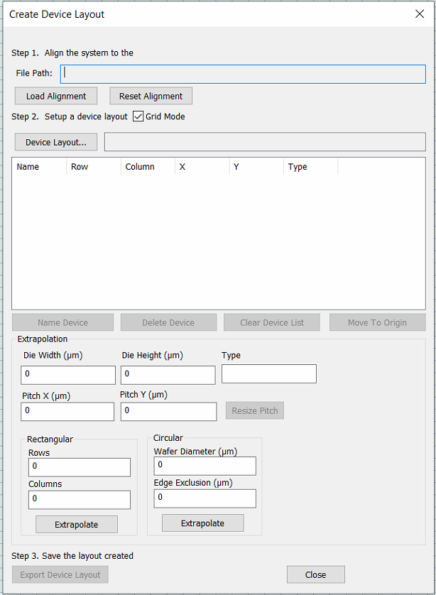 First, specify an alignment file and input the die and pitch measurements in the extrapolation section. Next, input the wafer diameter and edge exclusion values and click Extrapolate. This will allow users to extrapolate radially from the origin point, which is defined by the alignment file.