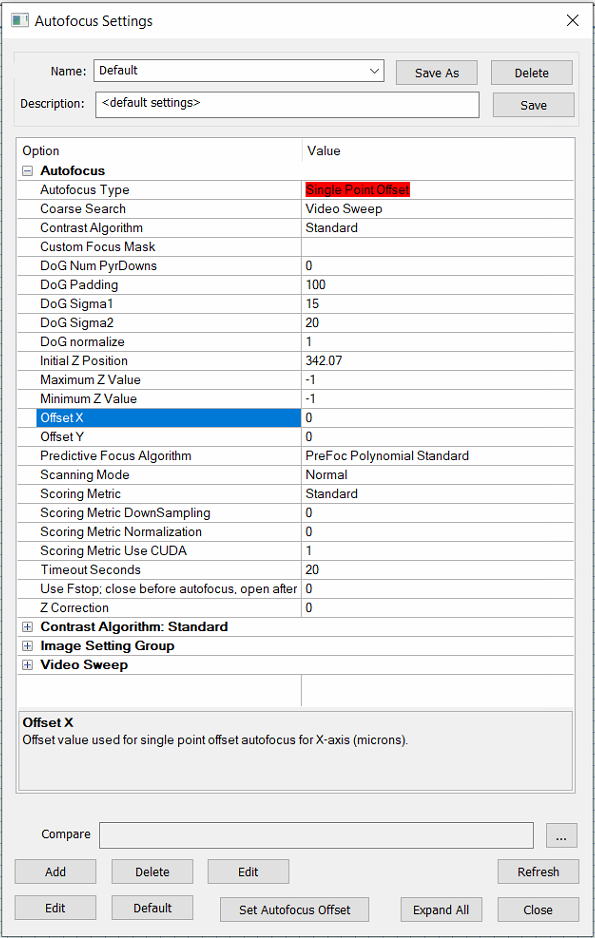 Users can now add offsets to their autofocus routines via Offset X and Offset Y fields (units are in µm) in the Autofocus settings dialog. Note that the offset parameters are enabled only when the Autofocus Type is set to Single Point Offset. Additionally, the autofocus routine must be for a Device Inspection scan. During the autofocus routine, autofocus is performed for each device at the offset location. If the Autofocus Type is set to Single Point Offset and the autofocus settings are applied to a non-Device Inspection scan, autofocus will simply not run at all.