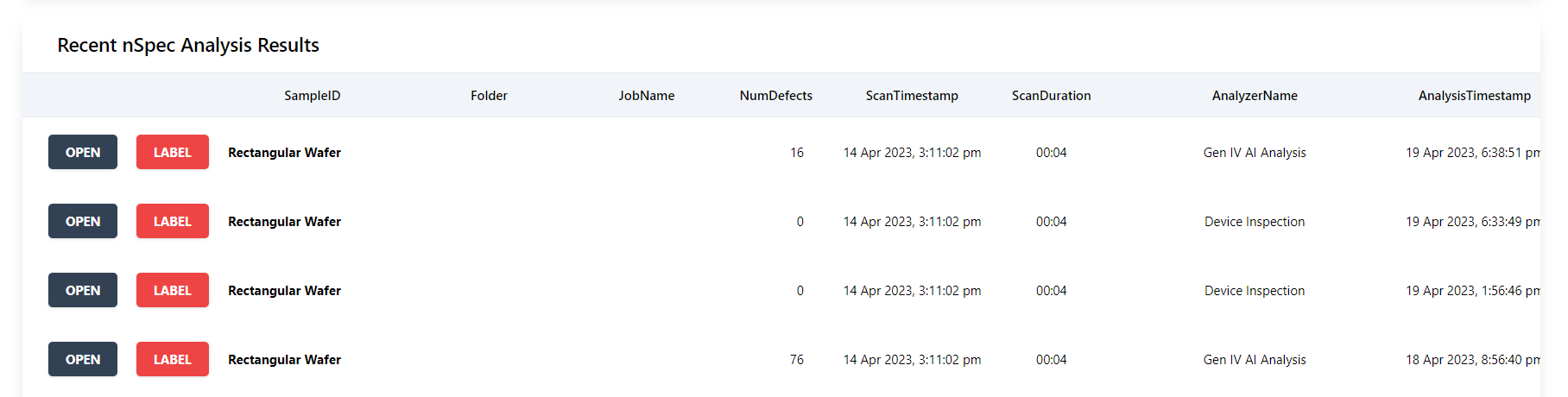 nReview does a scan of all of the nSpec analysis results on the nSpec machine and visualizes them in an easy to access way. For each analysis result, there are two buttons, Open and Label.