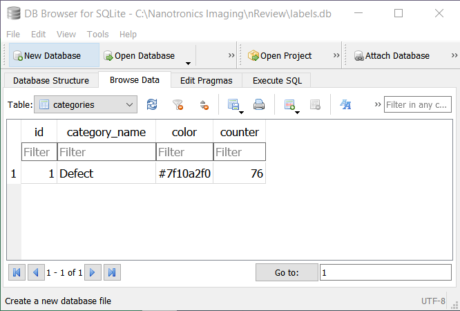 Clicking Open will open up nView. Clicking Label will generate a labels.db file in C: Nanotronics Imaging > nReview. This database file generates a categories table that shows all of the defects in this analysis labelled as Defect. Note that every time you press the Label button, the results for the analysis pressed will be appended to the existing labels.db file. This means that the results of multiple analyses can be combined into a single labels.db file.