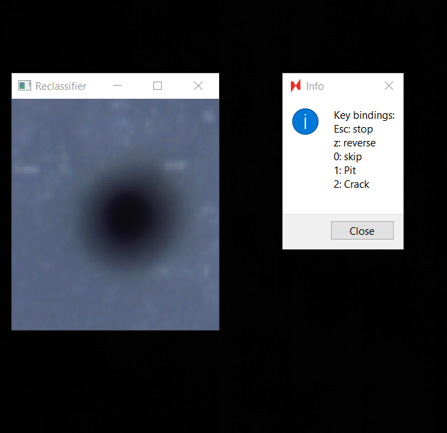 This will bring up two windows. The Reclassifier window shows an image of a defect, and the Info window shows directions for labelling. Now, labelling defects is as easy as pressing the number associated with the defect class of interest.