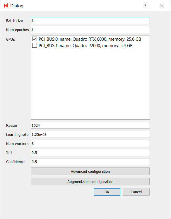 Adjust any parameters – recommend changing the Batch Size to 8 and Num Epochs to 100 – and then click OK to begin training the AI.