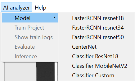 Note that when accessing the base models via AI Analyzer > Models, these options do not actually point at specific models, they are simply referencing the base model files. To actually utilize the listed base models in the menu options, you can click on any of the menu options, which will open a file dialog. The file chosen during this step is the actual model you are referencing, not necessarily the menu option chosen.