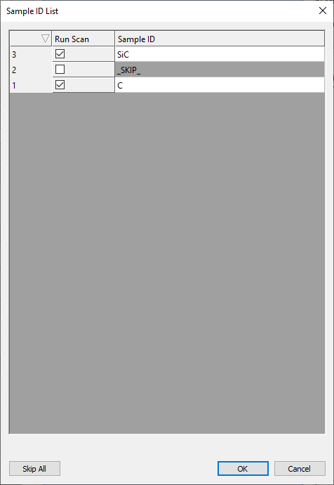 In the above Sample ID List dialog, checking the checkbox for a given wafer will include it in the scan, and unchecking it will skip it and automatically input _SKIP_ as that wafer’s Sample ID. The bottom left "Skip All" button seen in the above Sample ID List dialog will deselect all checkboxes when toggled. When all checkboxes are unchecked, the button changes to "Scan All", allowing the user to select all the checkboxes.