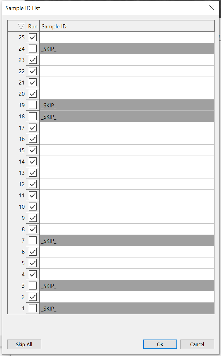 The above Sample ID List dialog would generate ;_SKIP_;;;;_SKIP__SKIP_;;;;;;;;;;_SKIP_;;;_SKIP_;_SKIPin the Scan > Sample field entry, with each scanned wafer encoded as a single semicolon and each skipped wafer encoded as _SKIP_.