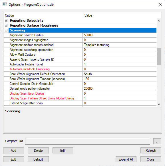A ”Scan Pattern Exceeds Stage X maximum by 0.000000 microns” message pops up on every wafer when running a wafer scan, wafer cassette job, loop job, or loop scan when the pattern offset is set to 0 for X and Y. A new Program Option Display Scan Pattern Offset Errors Modal Dialog can be set to prevent this message from popping up and disrupting the scan.